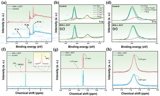 (a) XPS spectra of transport layer/perovskite interface with and without L-Ergothioneine modification. Fitting curves of Ti 2p (b) without L-Ergothioneine (Control), (c) with L-Ergothioneine. Fitting curves of O 1s (d) without L-Ergothioneine (Control), (e) with L-Ergothioneine. (f–h) Nuclear magnetic resonance (1H NMR) analysis of transport layer/perovskite interface with and without L-Ergothioneine modification.