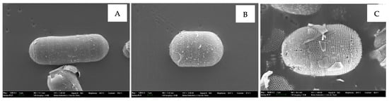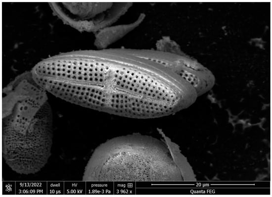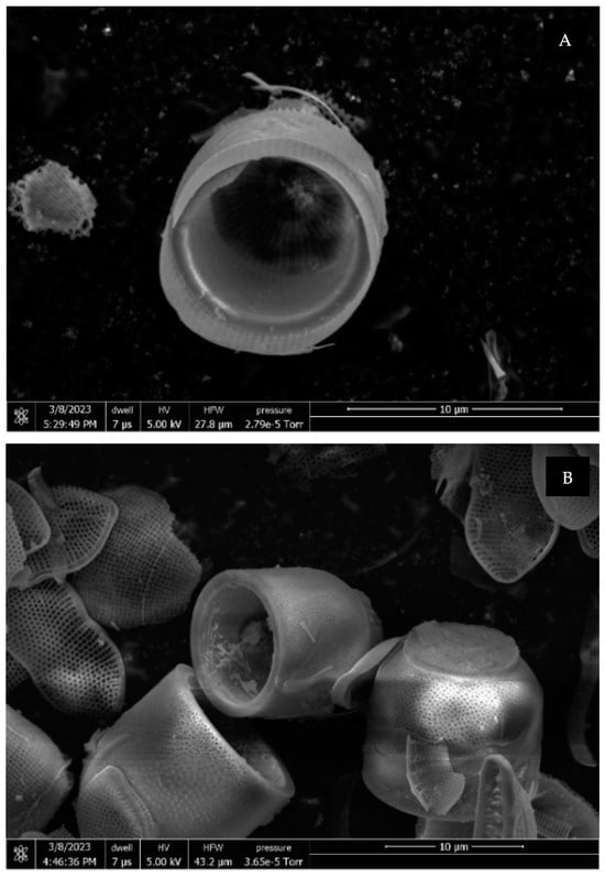 The experimental raw-material, Melosira nummuloides (RM), which serves as the negative control group without any organic matter removal treatment, and the positive control group, bio-silica prepared by high-temperature baking, were provided by JDK Bio Co. (Jeju, Republic of Korea) (Figure 1). The Melosira nummuloides used in this study exhibits a frustule diameter ranging from approximately 9 to 42 μm, with a girdle band height between 10 and 14 μm. The frustule surface features a porous structure, with pore sizes ranging from 0.08 to 0.09 μm. These characteristics provide a high surface area relative to its weight, enabling efficient energy and material exchange. The average morphological dimensions were determined to ensure consistency in the samples used for analysis.