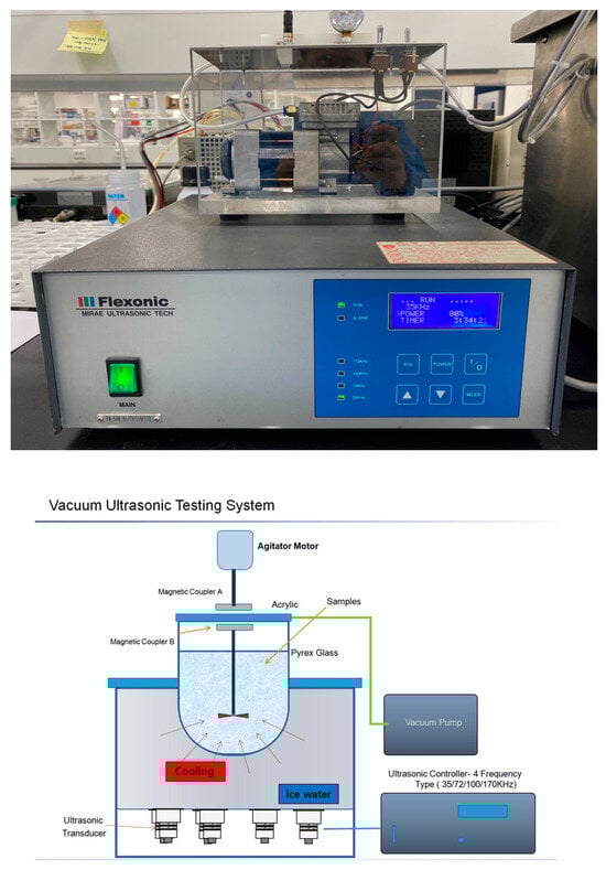 RM was produced from marine diatoms, M. nummuloides, isolated from lava seawater at concentrations of 2–4 cells/L. For large-scale cultivation, lava seawater was collected into a pond where M. nummuloides was cultured and harvested under optimal conditions. The harvested material was then washed with fresh water to desalinate and remove impurities, followed by natural dehydration to a moisture content of 85% or less through a 100 μm mesh filter. Bio-silica was produced from RM using methods based on freeze-dried M. nummuloides (FM) and ethanol-extracted M. nummuloides (EM). The process involved drying the diatoms at temperatures between 60 and 80 °C to remove moisture, followed by grinding. To eliminate organic matter, the material was treated with a hot solution of sulfuric acid/hydrogen peroxide or hydrochloric acid/hydrogen peroxide. Impurities were then removed by treating it with a 10% hydrochloric acid solution at 95 °C. After drying at 80 °C, the material was washed with distilled water at 65 °C, then vacuum dried at temperatures between 100 and 200 °C. The final product was diatom-derived bio-silica, with organic matter removed, ready for collection. The Vacuum Assisted Ultrasonic Stirrer (VAUSTM, Mirae Ultrasonic Tech., Bucheon, Republic of Korea) (Figure 2) utilized in this study can generate ultrasonic waves ranging from 35–170 kHz, in single or multiple frequencies. “+” indicates the presence of vacuum application, while “−” indicates the absence of vacuum application (Table 1).