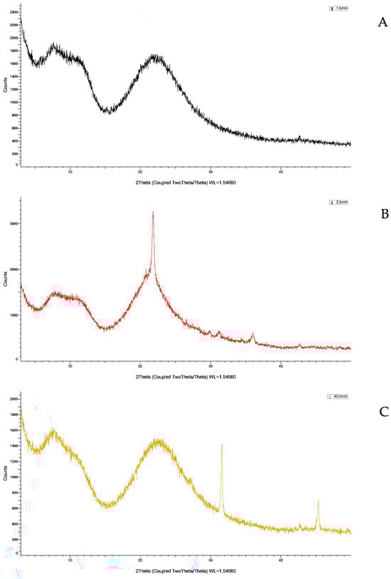 XRD images of frustule crystal structure analysis of M. nummuloides after organic matter removal at different time, frequencies, and vacuum application. (A) Negative control: RM (Raw-material Melosira). (B) Positive control: high-temperature-baked Melosira. (C) 35 kHz, 60 min, vacuum+ Melosira after organic matter removal. Peak identification and indexing were conducted using the ICDD PDF-4+ database. The crystalline SiO2 phase was identified using 01-070-3755 (alpha-quartz) and (CH)N-related phase; graphitic carbon was referenced using PDF 01-075-2078 to identify residual organic content.