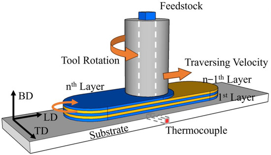 - Garcia, D.; Hartley, W.D.; Rauch, H.A.; Griffiths, R.J.; Wang, R.; Kong, Z.J.; Zhu, Y.; Yu, H.Z. In situ investigation into temperature evolution and heat generation during additive friction stir deposition: A comparative study of Cu and Al-Mg-Si. Addit. Manuf. 2020, 34, 101386. [Google Scholar] [CrossRef]