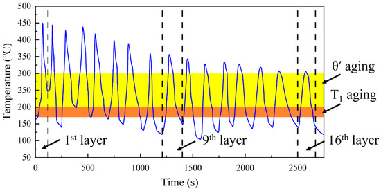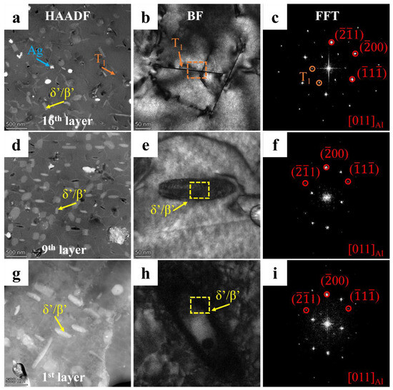 - The material flow through the layers can initiate a reset of the microstructure evolution caused by periodic heat input. The influence of periodic heat input results in the homogenization of grain size, the coarsening of the δ′/β′/θ′ ternary composite precipitate, and the dissolution of the T1 phase.