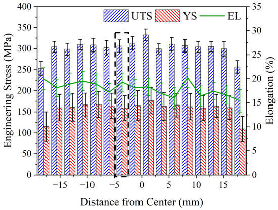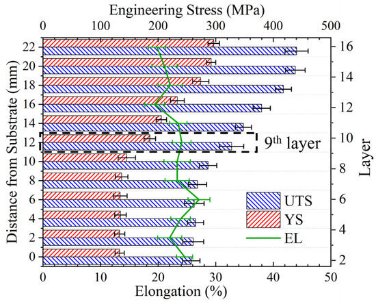 - The samples located in the last layers show superior mechanical properties compared to those of the intermediate layers and the first layers. Specifically, the samples located in the last layers show the highest microhardness of 117.0 Hv, YS of 296.6 MPa, UTS of 440.6 MPa, and EL of 27.1%, respectively.