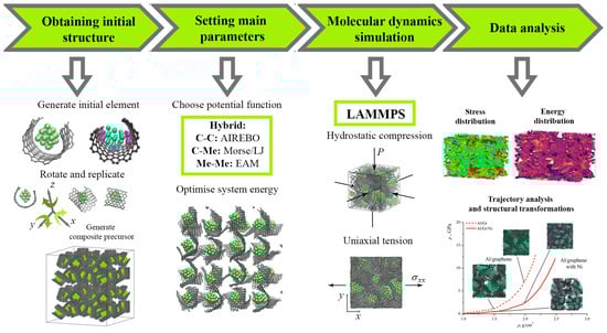 Molecular dynamics (MD) simulation can be a very helpful tool for searching new material, as well as for a detailed analysis of their properties and performance [51,52,53,54]. The review works of [51,52] showed how atomic-scale simulations can be used to investigate the microscopic structure–property relationships of nanocarbon-reinforced metal matrix composites, in which the physical properties, crystal orientations, interfacial structures, and mechanical behaviors could be studied under a wide range of working temperatures and strain rates. The tensile properties of different composites have been extensively studied via MD simulations [43,47,54,55,56]. The existing potentials are very effective for the description of new carbon and new composite materials, which allow for their successful applications [47,57]. The series of works by [43,47,52,55,56] studied different aspects of MD simulations concerning Me/graphene composites (graphene networks filled with Me nanoparticles) from the choice of interatomic potentials [47,52] to the detailed analysis of their physical and mechanical properties. It was found that the main factors affecting the fabrication of a composite are the sizes of nanoparticles, the orientations of structural units, and the temperatures of hydrostatic compression [55]. It was found that the higher the Ni content in the composite, the higher the thermal conductivity; however, this decreases the composite strength [56]. Based on the obtained results, new important issues have been revealed: the need to increase the bonding between GF and metal, as well as the need to analyze their property control to obtain composites with specific properties.
