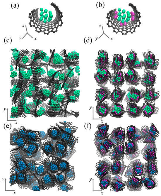 Figure 2 presents the structural element of the composite in a perspective view and the initial composite precursor in accordance to the -plane. As can be seen, the structural element consists of a graphene flake (GF) and metal (Me) nanoparticle inside. The graphene flake is decorated by the Ni nanoclusters (shown in purple). This structural element is randomly rotated and repeated four times along all axes to obtain the composite precursor. For simplicity, the composites are named as Al/GF and Cu/GF; Al/GF/Ni and Gu/GF/Ni for Ni-decorated structures. The final structural state of the composite precursor after relaxation is shown in Figure 2c,d for the Al/GF system and in (e,f) for the Cu/GF system. After relaxation, the initial ideal shape of the GF is changed according to the interatomic potential function acting on the system.