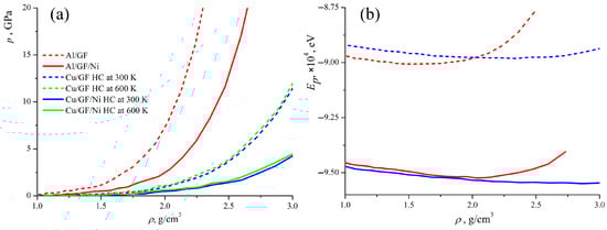 Pressure (a) and potential energy (b) as the function of composite precursors’ density during hydrostatic compression. Pressure–density curves are presented for all the considered structures. Energy–density curves are presented just for four representative structures Al/GF, Al/GF/Ni, Cu/GF, and Cu/GF/Ni.