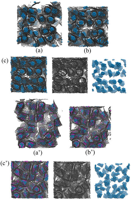 Figure 4 presents the snapshots of Cu/GF (a–c) and Cu/GF/Ni (a’–c’) structures during HC at 300 K as an example. For HC at 600 K, no differences were found except for the formation of a higher number of covalent bonds between graphene flakes. Thus, all the processes during compression can be analyzed from the snapshots for HC at 300 K. As can be seen, even after initial relaxation, composite precursors are very similar (see Figure 4). The copper nanoparticles are covered with graphene in both cases; however, in the presence of Ni clusters, the graphene “balls” are even denser, and the Cu atoms are strongly attached to the Ni/GF surface (which is found from the analysis of energy per atom). In the structure without Ni, Cu nanoparticles can coagulate when flake edges are opened. For Cu/GF/Ni, this coagulation of metal atoms is impossible. The distribution of nanoparticles over the graphene network is very similar in both cases.