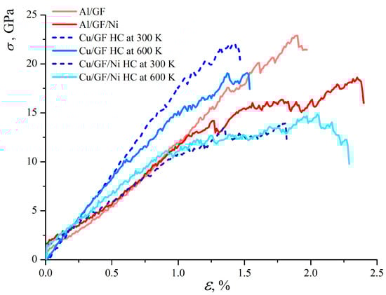 As can be seen from Figure 6, the strength of the Ni-decorated composite is much lower than that of the Cu/GF composite for both 300 and 600 K. The same is found for the Al/GF composite in comparison with the Al/GF/Ni composite. Young’s modulus for Cu/GF/Ni, Al/GF, and Al/GF/Ni is close and equal to 12 GPa.