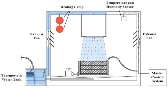 A dramatic cooling–heating cycle simulation test equipment developed by our research team was used. As shown in Figure 1, it includes a heating system, rainfall system, water supply system, and dehumidification system. The heating system comprised six 275 W heating lamps and various temperature sensors in the box. The rainfall system mainly included square rain sprinklers, water temperature sensors, an adjustable flow rate pump, and a water-discharging test stand. The water supply system includes a thermostatic water tank, a water storage tank, a water level sensor, and a water pipe. To simulate the rapid decrease in temperature due to sudden rainfall on the high-temperature pavement in summer, the difference between the initial temperature of the asphalt mixture and the rain temperature was used to characterize the large temperature decreases of the pavement. To simulate the rapid heating and drying of the pavement after heavy rainfall, the rain duration was used to characterize the influence of the rain intensity on the pavement temperature. Meanwhile, high temperatures and rainstorms are often cyclical in summer, and repeated heating following rainstorms puts the asphalt mixture under dry–wet cycles of rainfall cooling and solar heating. These cycles exert cyclical effects on the pavement temperature. Therefore, different test parameters, such as the initial temperature of the asphalt mixture, rain temperature, rain duration, and number of cycles, were set to analyze the variation patterns of the pavement temperature field under dramatic cooling–heating cycles. In this test, the heating rate of the dramatic cooling–heating cycle equipment was set to 65.9 °C/h, the rain rate was set to 3.5 mm/min, and the rain temperature was 20 °C.