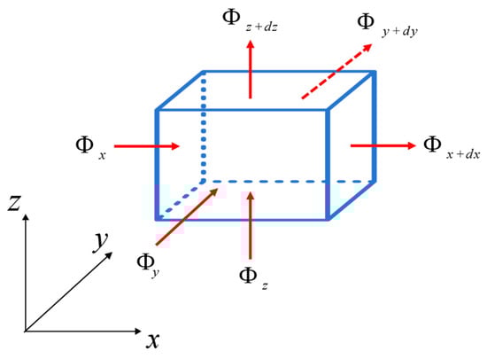 where represents the value of the direction component of the heat flow at point , and the rest can be derived by analogy. The heat flux of the microelement derived based on surfaces , and can also be expressed in Equation (8) according to Fourier’s law.
