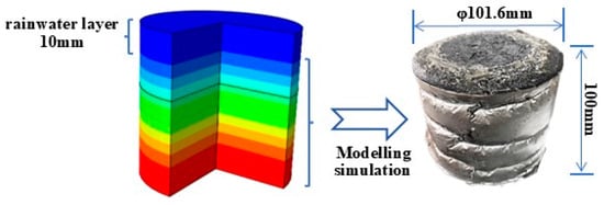 The following assumptions are made for the pavement structure under dramatic cooling–heating cycles: (1) each structural layer of the road surface is uniform, continuous, and isotropic; (2) the heat conduction between the structural layers is continuous; and (3) considering that the rainwater only directly contacts the surface of the pavement during rainfall, the transient temperature changes inside and on the sides of the pavement are relatively small, and the sides of the Marshall specimen are set as adiabatic boundaries. (4) The temperatures of the lower surface layer and below were set to a constant value.