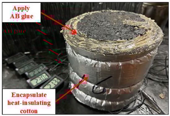 To validate the finite element simulation model, a layered Marshall specimen was prepared according to the T0702-2011 Chinese standard [24]. Temperature sensors were installed at 4 mm, 15 mm, 30 mm, 50 mm, 70 mm, and 90 mm below the road surface to measure the road surface temperature field in the laboratory (Figure 6). Considering that only the asphalt pavement surface is in direct contact with rainwater during rainfall, the sides of the specimen were wrapped with waterproof and heat-insulating insulation cotton, and the edges of the insulation cotton were sealed to the specimen using AB glue, thus rendering the layered Marshall specimen waterproof and thermal insulated (Figure 7).