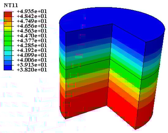 The validity of the finite element model was verified using the measured temperature field data in the laboratory. The temperature field was constructed according to the boundary conditions. The initial temperature of the rainwater layer and the field temperature were set to 20 °C, the initial temperature of the asphalt mixture specimen was set to 50 °C, the time step was set to 1 min during rainfall and 2 min during heating, and the number of cycles was set to 5. The simulation results are presented in Figure 8.