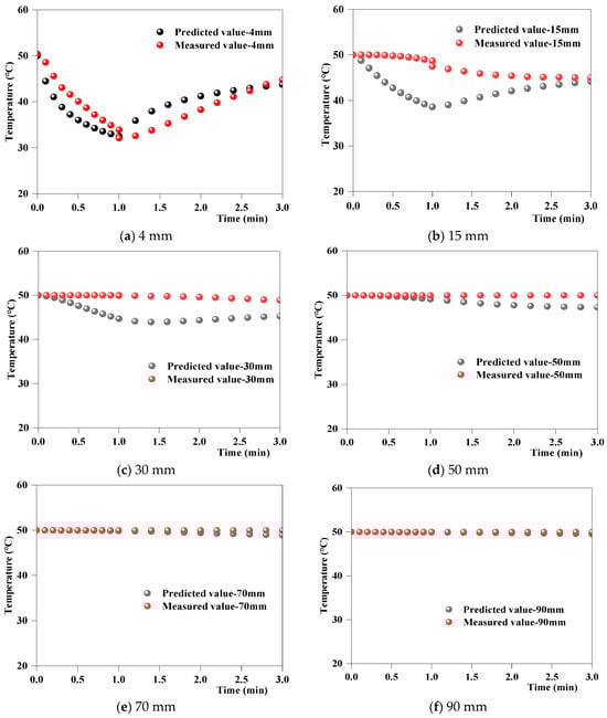 The relationship between the simulated and measured temperature fields at different depths under the road surface was further analyzed, and the error indicators were calculated (Table 6). The errors at 15 mm beneath the road surface were relatively large, with a maximum relative error δ of 10.1%, MAE of 5.08, and RMSE of 6.02. In contrast, the errors at the other depths were small. Thus, the deviation between the simulated and measured temperatures at different depths beneath the road surface was small, and the prediction accuracy of the finite element model was good.
