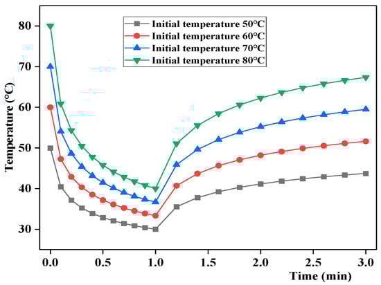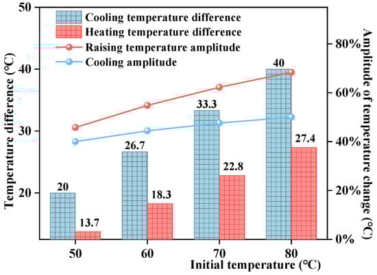 As shown in Figure 11, the road surface temperature first decreased and then increased at different initial asphalt mixture temperatures. At a higher initial temperature, the temperature decrements and increments during cooling and heating were greater. With an initial temperature of 50 °C, the cooling temperature decrement was 20.0 °C, while the heating temperature increment was 13.7 °C. At an initial temperature of 80 °C, the temperature decrement and increment during cooling and heating are 40.0 °C and 27.4 °C, respectively. The temperature change amplitudes of the cooling and heating stages were used to further quantify the influence of different initial temperatures on the evolution of road surface temperature. The results are shown in Figure 12. As the initial temperature increased, the temperature change amplitudes of the cooling and heating stages increased, and the temperature change gradient during heating was greater than that during cooling. These results indicate that with a higher pavement temperature, the surface temperature variation was greater, and the temperature field variations were more significant.