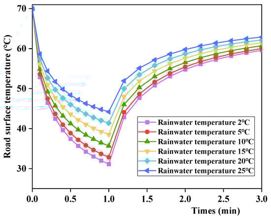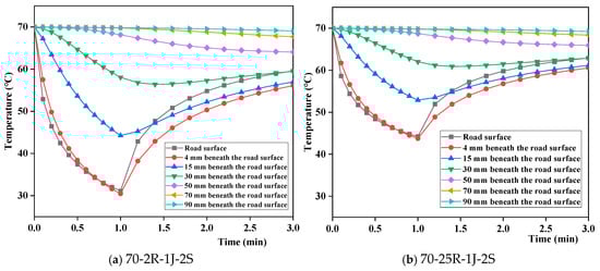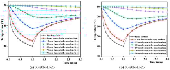 As the dramatic cooling–heating cycles mainly simulate high temperatures and brief rainfall, the difference between the rain temperature and pavement temperature significantly impacts the pavement temperature field. A review of the relevant literature [30] showed that the rain temperatures in the southeastern coastal area of China were 2.6 °C to 23.1 °C. Therefore, the rain temperatures in the simulation test were set to 2 °C, 5 °C, 10 °C, 15 °C, 20 °C, and 25 °C. The test results are shown in Figure 14.