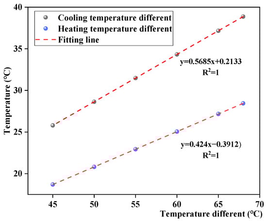 According to Figure 14, the changes in road surface temperature were greater with a lower rain temperature, that is, a greater temperature difference. With the same initial temperature of the asphalt mixture, the pavement temperature variation patterns remain unchanged under different rain temperatures, first decreasing and then increasing. Moreover, the pavement cooling rate was higher, whereas the heating rate was lower under a lower rain temperature. Further analysis found that different dramatic cooling–heating conditions have a linear relationship with the pavement temperature difference, as shown in Figure 15, and the cooling rate was larger than the heating rate.