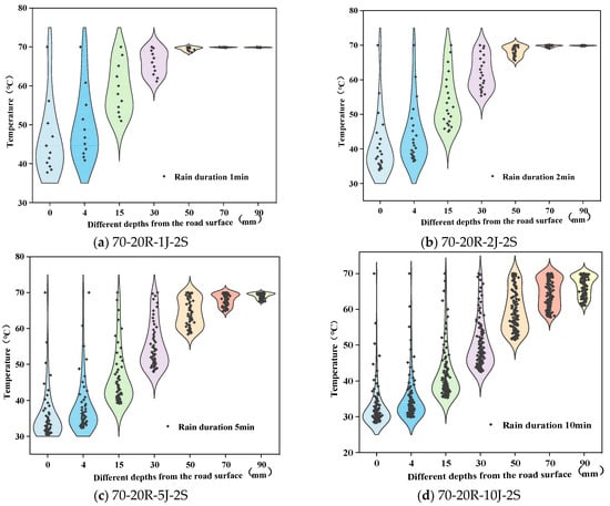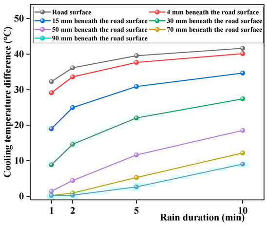 The impact on the pavement temperature field was greater with longer rain durations, that is, greater rain intensities. The rain durations selected in this study were 1 min, 2 min, 5 min, and 10 min, respectively, and the effect of rain duration on the pavement temperature field was analyzed. The results are shown in Figure 17.