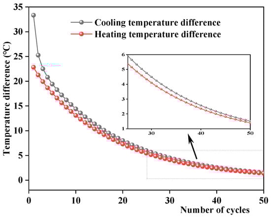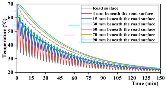 The number of cooling–heating cycles was set to 50 to analyze its effect on the temperature field of the asphalt pavement. The simulation results are shown in Figure 19.