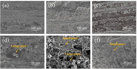 Figure 2 illustrates the microstructures of the PP, PS and PC preforms. As shown in Figure 2a,d, a significant number of pores were observed on the cross-section of the PP preform, attributed to cracks or large pores formed due to the substantial shrinkage of the matrix during the pyrolysis of the phenolic resin. These pores likely include some closed pores that became exposed during the cutting process for sample preparation. The carbon produced by the pyrolysis of phenolic resin was primarily distributed within the SiC fiber bundles, with minimal carbon content present between the bundles, leading to pore formation. The woven structure of the SiC fiber cloth facilitated the development of closed pores and interlayer cracks between the fiber bundles. Additionally, shrinkage cracks and structural collapse from the pyrolysis of phenolic resin further contributed to the formation of closed pores. Conversely, the carbon matrix within the SiC fiber bundles remained largely intact, featuring a relatively thicker carbon layer, which could hinder subsequent molten silicon infiltration [31].