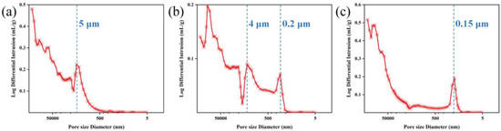 Figure 3. The pore size distributions of the green preforms: (a) PP, (b) PS, and (c) PC.