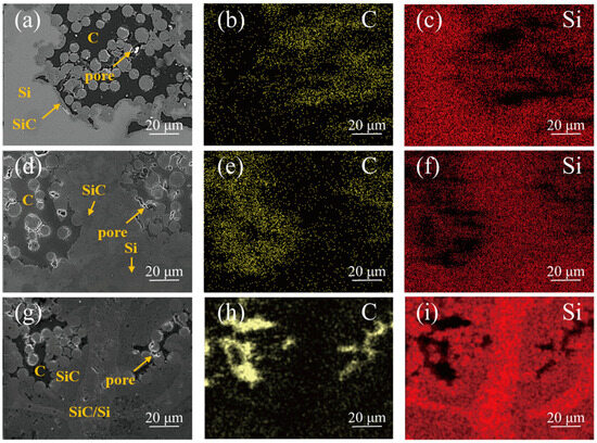 In the PC composite, as shown in Figure 5g, over 90% of the observed area displayed an indistinguishable boundary between the fibers and the matrix, indicating a highly ideal microstructure. Figure 5h,i illustrate the distribution of C and Si elements, respectively. The dark regions in Figure 5h predominantly consist of residual carbon. The extensive presence of Si elements in Figure 5i signifies that the Si/C reaction during the RMI process was thorough. The PC preform exhibited the smallest internal pores among the three samples. A smaller pore structure generates higher capillary forces, facilitating a faster and more complete melt infiltration process. The variations in the red’s brightness, indicating differences in Si content, suggest uneven distribution of Si elements between SiC and residual Si regions. Residual carbon may be present in areas encapsulated by SiC, preventing further reaction with Si. The chemical stability of SiC hinders the dissolution of excess carbon into the silicon melt. Additionally, gaps between SiC fiber bundles were filled with SiC, allowing carbon to dissolve in molten silicon rather than forming an inert layer within the fiber bundles. These conditions resulted in a thicker SiC layer compared to the other two samples, contributing to a reduction in residual carbon content.