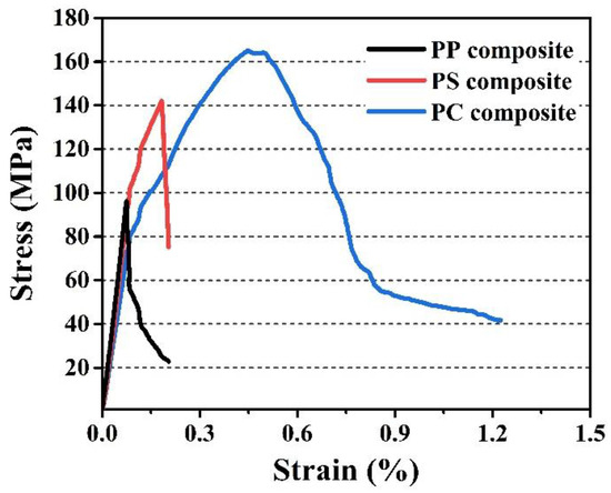 Figure 6. The flexural stress-strain curves of the PP, PS, and PC composite samples.