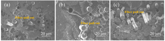 Figure 7. The SEM micrographs of typical fracture surfaces of SiCf/SiC composite samples: (a) PP, (b) PS, and (c) PC.
