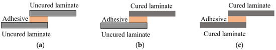 In the fabrication of composite structures, mechanical fastening with bolts and nuts and adhesive bonding using various adhesion processes are commonly employed. Adhesion processes for laminating composite panels, as illustrated in Figure 1, include co-curing, co-bonding, and secondary bonding [12]. The co-curing process is a method where the adhesive layer between the two uncured laminates is also cured simultaneously, as shown in Figure 1a. The co-bonding process consists of curing the adhesive between a pre-cured laminate and an uncured laminate, with the adhesive layer curing simultaneously with the uncured laminate, as shown in Figure 1b. Meanwhile, the secondary bonding process involves curing the adhesive between pre-cured laminates, as illustrated in Figure 1c. Brito et al. [13] compared the mode I interlaminar fracture toughness of joints created using simultaneous and secondary bonding techniques, discovering that simultaneous bonding resulted in higher toughness at the adhesive joint where cracks occurred. Similarly, Shiino et al. [14] found that joints fabricated using simultaneous bonding exhibited higher mode I interlaminar fracture toughness compared to those made with resin infusion. These findings demonstrate that interlaminar fracture toughness varies significantly depending on the adhesion process used.