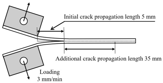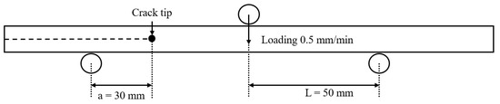 The mode II interlaminar fracture toughness tests were conducted in accordance with ASTM D7905 [18] standards. The ENF specimen geometry is identical to that of the DCB specimen, but the loading blocks were removed since bending loads were applied as shown in Figure 5. Figure 6 shows the schematic of the ENF test, with a span length of 100 mm. The test was conducted until the crack tip reached 30 mm from the left support, at the test speed of 0.5 mm/min.