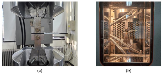 Photos of mounting of DCB specimens for DCB tests: (a) at room temperature; (b) in environmental test oven.
