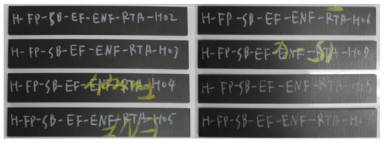 The factors for the DCB test are designated as A, B, and C. Factor A represents the temperature, which includes low temperature (−53 °C, CTA), room temperature (23 °C, RTA), and high temperature (93 °C, ETA). Factor B signifies the surface treatment methods, including peel ply (PP) treatment, fuse plasma (FP) treatment, and sanding (SD). Factor C refers to the bonding processes, which include co-bonding (CB) and secondary bonding (SB). Peel ply treatment involves attaching and removing a textured fabric to the surface of the prepreg before curing. Sanding is the method of abrading the surface using sandpaper or other abrasive tools. Fuse plasma treatment uses high-energy gas to remove surface contaminants and chemically activate the surface to enhance adhesive performance. To design the DCB tests with the minimum number of runs, a mixed-level design was implemented, resulting in an L18 orthogonal. Based on this orthogonal array, five valid data points were obtained for each experimental condition.