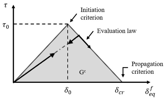 A prominent analytical approach for predicting progressive damage within bonded joints of composites includes CZM (cohesive zone model), VCCT (virtual crack closure technique), and XFEM (extended finite element method) [24]. CZM defines the initiation and propagation of cracks using parameters such as adhesive strength and damage energy. In contrast, VCCT predicts crack propagation direction similar to CZM but does not account for initial damage. XFEM is useful for predicting complex crack shapes by representing cracks within elements of a localized model. In this study, CZM, which can simulate both the formation of initial cracks and their progression, was applied to model the bonded joints.