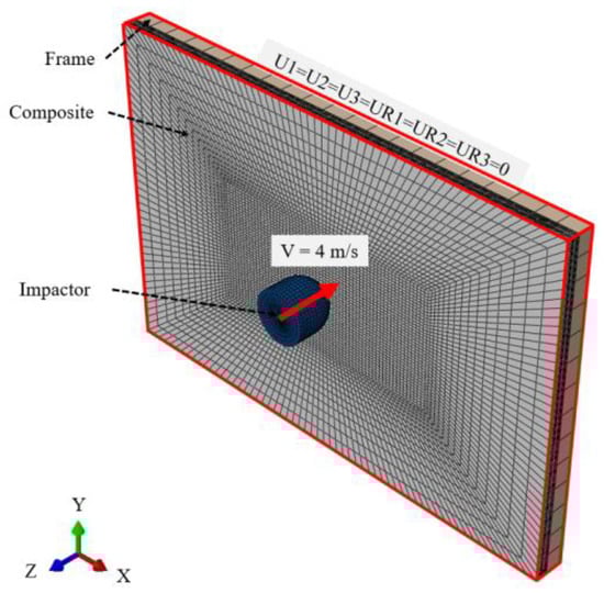 Each layer of the composite panel was modeled using 3D continuum shell elements, employing 8-node SC8R elements. Cohesive zones were introduced between layers using 3D 8-node cohesive elements (COH3D8). The panel used 8-node hexahedral shell elements (SC8R), while the impactor and frame utilized 4-node quadrilateral solid elements (R3D4). Element sizes within the central area of the panel 72 mm × 36 mm were set at 1.2 mm × 0.9 mm × 0.5 mm, increasing gradually away from the center. Element sizes for the impactor and frame were 1.5 mm and 5 mm, respectively. The total number of elements and nodes in the entire model were 169,416 and 254,912, respectively.