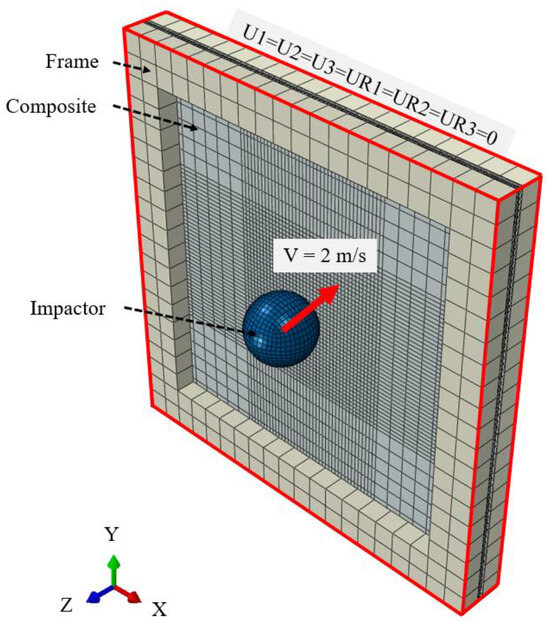 The total analysis time was set to 2 ms, with each time step set at 0.1 ms. General contact was applied throughout the entire model with a uniform friction coefficient of 0.3. The impactor was fully constrained in all directions except the z-direction from the initial step, and its velocity was set to 2 m/s to achieve an initial impact energy of 2 J. The edges of the laminate and the entire frame were constrained in all directions.