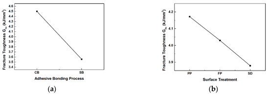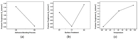 The response factor in Taguchi design is the mode I interlaminar fracture toughness, and it was analyzed based on three factors from DCB tests. The Taguchi design analysis results for the three factors in DCB tests are shown in Figure 12. Figure 12a depicts the main effects plot for the adhesion process factor on the average mode I interlaminar fracture toughness. Figure 12b illustrates the main effects plot for the surface treatment factor, and Figure 12c indicates the main effects plot for the temperature factor. As the main effects lines for all three factors are not horizontal, it indicates that each factor significantly influences the mode I interlaminar fracture toughness.