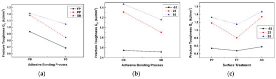 The interaction plot for the average mode I interlaminar fracture toughness is depicted in Figure 13. The interaction between the adhesion process and surface treatment is not parallel for all three lines, as shown in Figure 13a. This result indicates that the interaction between the adhesion process and surface treatment is significant. Figure 13b depicts the interaction plot between the adhesion process and test temperature. It was noted that the interaction lines for room temperature and high temperature are parallel to each other, whereas the line for low temperature is not parallel to them. Therefore, the interaction between the adhesion process and test temperature is significant at low temperatures. Figure 13c shows the interaction plot between surface treatment and test temperature. Since the interaction lines for each condition are not parallel, the interaction between surface treatment and temperature is significant.