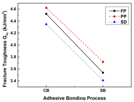The interaction plot for the average mode II interlaminar fracture toughness is shown in Figure 15. Since there are two factors involved, only one interaction plot is generated. The lines representing the interaction between the two factors are nearly parallel, indicating that there is no significant interaction between them. When interaction effects between factors are not significant, optimal conditions can be determined using main effects plots. Through the main effects plot, we identified the condition that maximizes the average mode II interlaminar fracture toughness. It was confirmed that the mode II interlaminar fracture toughness is maximized under the co-bonding adhesive bonding and peel ply treatment condition. This conclusion aligns with the optimal condition identified from the test results in Table 10.