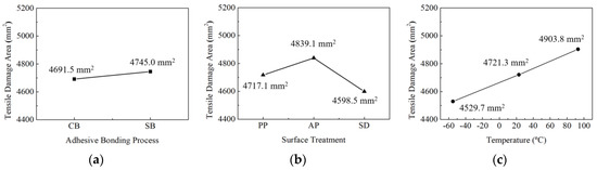 Comparison of matrix tensile damage area as experimental factors: (a) adhesion process; (b) surface treatment; (c) temperature.