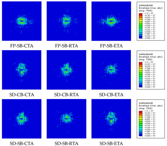 To compare the size of tensile damage areas in the base according to different factors, averages were calculated based on the results in Table 13, and the results were represented graphically as shown in Figure 17. Regarding adhesion processes, the damage area was significantly larger with secondary adhesion (4745.0 mm2) compared to co-bonding adhesion (4691.5 mm2), as shown in Figure 17a. Surface treatment resulted in varying damage area sizes with fuse plasma treatment (4839.1 mm2), peel ply treatment (4717.1 mm2), and sanding (4598.5 mm2) in descending order, as shown in Figure 17b. In terms of temperature, damage area sizes were observed in the order of 93 °C (4903.8 mm2), 23 °C (4721.3 mm2), and −53 °C (4529.7 mm2), as shown in Figure 17c. This suggests that lower temperatures increase the Hashin damage properties of the composite, resulting in smaller areas of damage.