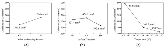 Comparison of delamination area as experimental factors: (a) adhesion process; (b) surface treatment; (c) temperature.