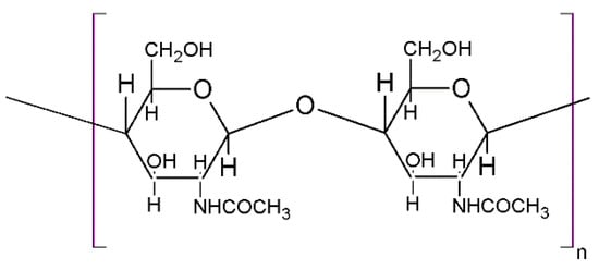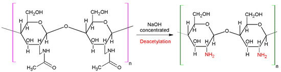Chitin, with the chemical structure described in Figure 2, and chitosan possess some similarities with cellulose structure. However, the main difference appears at C-2 in the cellulose structure, where the hydroxyl group is replaced with an acetamide group [46]. Chitosan, a partially deacetylated structure of chitin, is a linear polysaccharide composed of β-(1–4)-linked D-glucosamine and N-acetyl-D-glucosamine units randomly mixed [47]. The chemical reaction of chitosan extraction is based on the transformation of almost all the acetamide groups into primary amino groups [46] by a hydrolysis process, as can be observed in Figure 3. In almost all cases, some residues of acetamide groups are still found in the chitosan structure; however, due to the presence of these amino groups, chitosan is chemically more active [46,48].