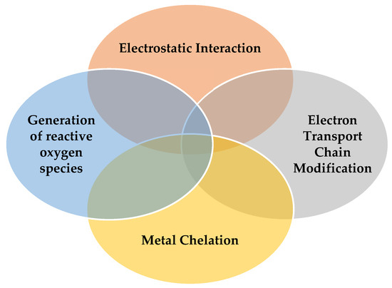 Chitosan and their derivatives exhibit varying efficacy against Gram-negative and Gram-positive bacteria. The antimicrobial effect is related to the interactions between polycationic chitosan and the anionic chemical groups from the cell membrane. This interaction allows the disintegration of the cell and the leakage of various intracellular constituents [75,76]. The mechanism is complex and depends on several factors, summarized below in Figure 5.