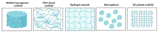 Tissue engineering has been used in recent years for the reconstruction of tissues and organs injured or for the replacement of specific damaged tissue in living organisms. The development of the medical engineering field has allowed for the fabrication of alternative materials able to simulate the original extracellular matrix of the body by maintaining or improving tissue functions [107,108]. The design of these types of similarities between the material and the extracellular matrix can offer better interaction between human cells and the biomaterial and can induce faster tissue regeneration. In tissue engineering, the cells that support the healing processes in the body are activated through growth factors or genes, so they initiate the reconstruction of the new targeted tissue [109]. Hydrogels and scaffolds based on chitosan are among the most developed materials for skin/bone tissue engineering. Examples of three-dimensional scaffolds are presented below in Figure 6, according to a recent open-access review article [47].