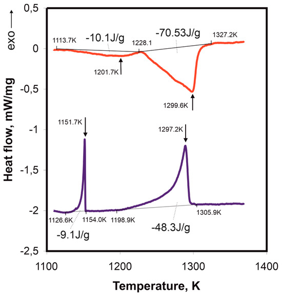 Figure 1 presents the DSC analysis results for the Mn16Cr16Ni16Fe16Co16Ni16P20 alloy during heating and cooling. During heating (red curve), two distinct endothermic peaks are observed. The first peak starts at 1113.7 K, reaches a maximum at 1201.7 K, and ends at 1228.1 K, with an absorbed energy of −10.1 J/g. The second, more intense endothermic peak begins at 1297.7 K and ends at 1327.2 K, corresponding to the melting process, with an energy absorption of −70.53 J/g. During cooling (blue curve), two exothermic peaks appear, indicating crystallization processes. The first peak starts at 1126.6 K, reaches a maximum at 1154.0 K, and ends at 1198.9 K, with a released energy of −9.1 J/g. The second, more pronounced exothermic peak begins at 1198.9 K, reaches a maximum at 1297.2 K, and ends at 1305.9 K, releasing −48.3 J/g, suggesting the crystallization of the primary phase from the liquid.