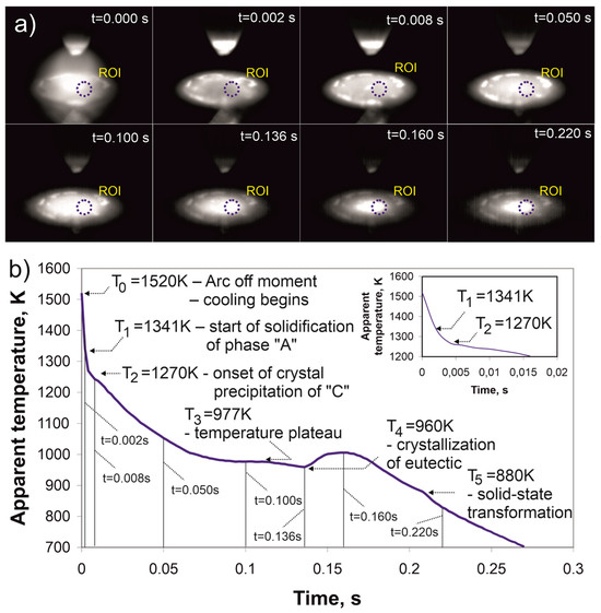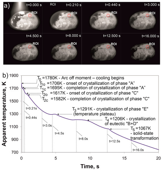 Thermal imaging of the welding process was conducted using a FLIR SC7650 mid-wave infrared camera (FLIR Systems, Wilsonville, OR, USA). The infrared data were captured through a CaF2 window with the ResearchIR thermal imaging system and processed on a computer station equipped with both ResearchIR (version 4.40, FLIR Systems, Wilsonville, OR, USA) and Altair software (version 2024, Altair Engineering Inc., Troy, MI, USA). The 2 g ingot was initially melted in an arc furnace, with real-time temperature changes recorded by the infrared camera. Subsequently, a short-duration electric arc was applied directly to the ingot’s surface in air using a TIG-300D PRO 400V UT 26/8 inverter welding machine (Sherman, Warsaw, Poland), with a current pulse of 200 A and a duration of 100 ms. Temperature variations were monitored continuously in a region of interest (ROI) to track phase transformations.