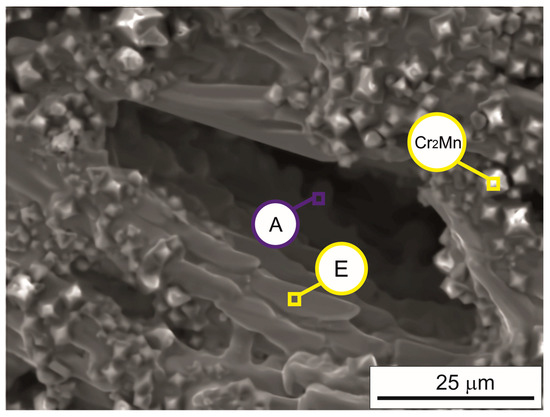 SEM image of the free surface of the ingot after arc remelting and cooling in a pure argon atmosphere. Dendrites of phase “A”, elongated crystals of phase “E”, and small precipitates of a Cr2Mn-like phase with a square-based pyramidal morphology are visible. Sample preparation: Metallographic specimens were mechanically polished and etched using a 3% nitric acid solution in ethanol. SEM observations were performed at an accelerating voltage of 20 kV.