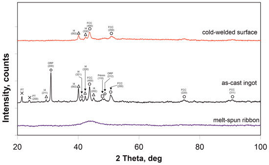 Figure 6 shows XRD patterns of the Mn16Cr16Ni16Fe16Co16P20 alloy in three different processing states: arc-melted ingot, surface heated by a short electric pulse, and melt-spun ribbon. For the arc-melted ingot, several phases were identified, including FCC, tetragonal, and orthorhombic phases. The sample heated by a short electric pulse primarily exhibited FCC and tetragonal phases, while the melt-spun ribbon showed a broad intensity maximum, indicating an amorphous structure.