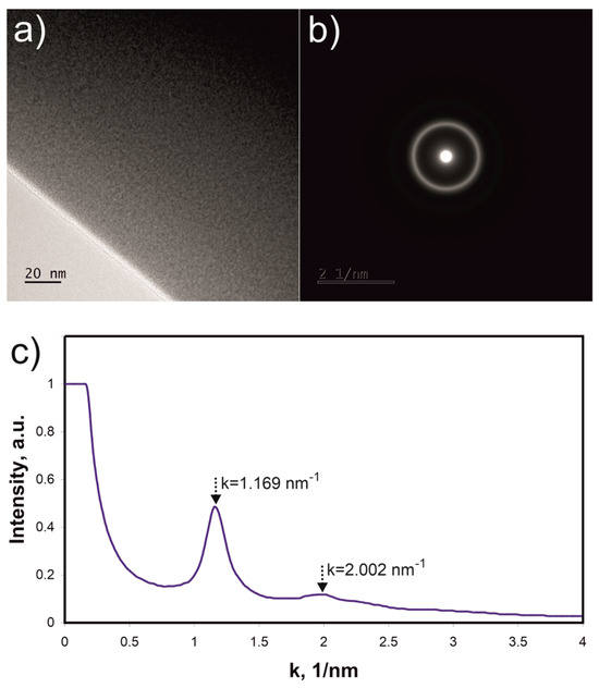 High-resolution TEM imaging and XRD analysis confirmed the amorphous nature of the ribbon produced via melt-spinning. The intensity profile of the diffraction rings observed in TEM, with two broad peaks at wave vector values of k = 1.169 nm−1 and k = 2.002 nm−1, corresponds to characteristic features of reciprocal space scattering in amorphous structures. These values are indicative of the short-range atomic ordering typical of metallic glasses based on transition metals and phosphorus. The diffuse peaks in this study are consistent with XRD results, which revealed a broad intensity maximum characteristic of amorphous structures. Similar diffuse diffraction patterns and broad peaks in reciprocal space have been reported in [25] for other amorphous systems, further validating the successful amorphization achieved through rapid cooling during the melt-spinning process.