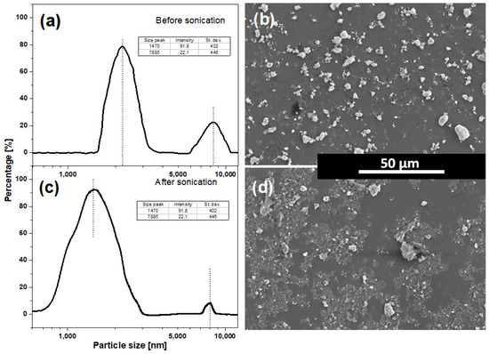 Commercially available HAp microparticles (Alfa Aesar, Thermo Fisher Scientific, Waltham, MA, USA) without any additional purification were used as a starting material. The powder was characterized using a Zetasizer Nano ZS with 632.9 nm laser source (Malvern Panalytical, Malvern, UK) and SEM imaging and the results are shown in Figure 2. As presented in Figure 2a, the measurements of the raw HAp nanoparticles indicate two major size fractions: larger (approximately 8.5 µm) and smaller (approx. 2.2 µm). Sonication of the suspension for 10 min significantly decreased the percentage of the largest particle fraction (23% → 8%), increased it for the smaller one (77% → 91%), and decreased the mean particle size in both fractions (8.5 µm → 8 µm and 2.3 µm → 1.5 µm, respectively)—Figure 2c. This effect was clearly confirmed by SEM imaging (Figure 2b,d). Further sonication did not cause any visible differences in particle sizes.